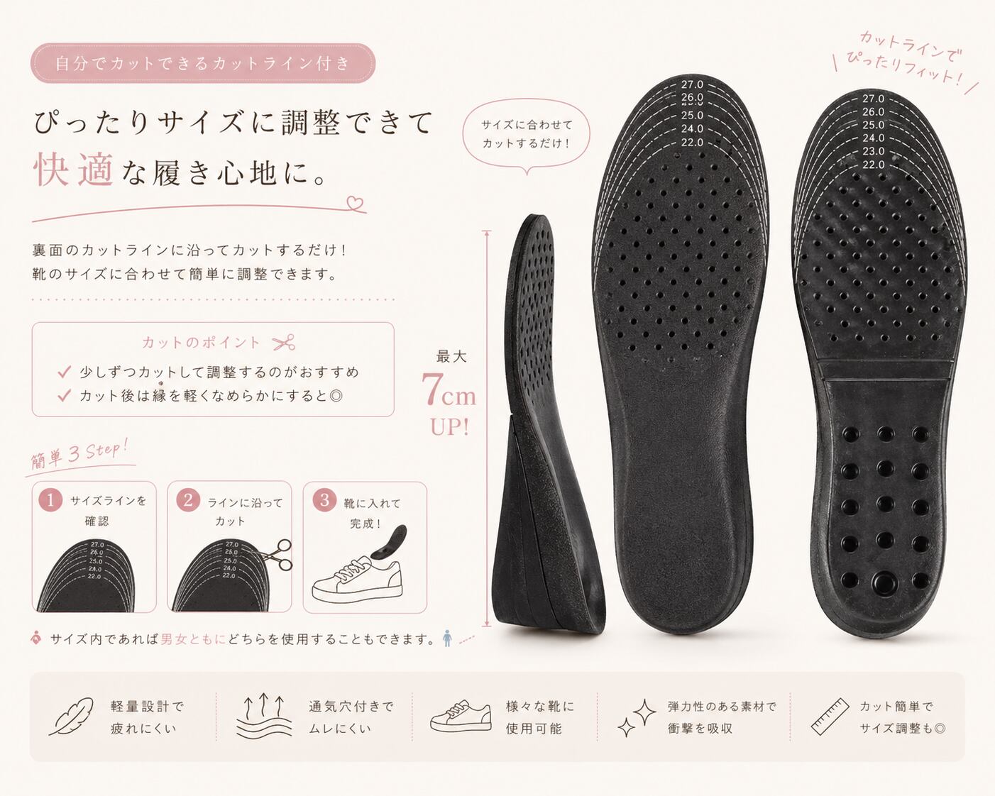 7cm盛れる 3層美脚インソール|3cm・5cm・7cm調整可能 取り外し式タイプ