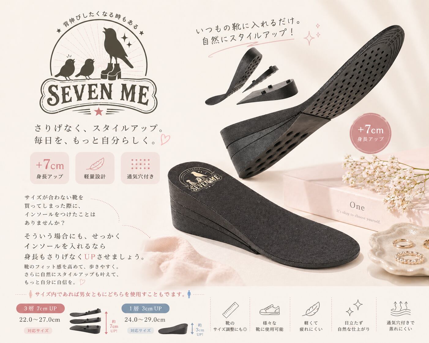 最大7cmアップできる美脚インソール。